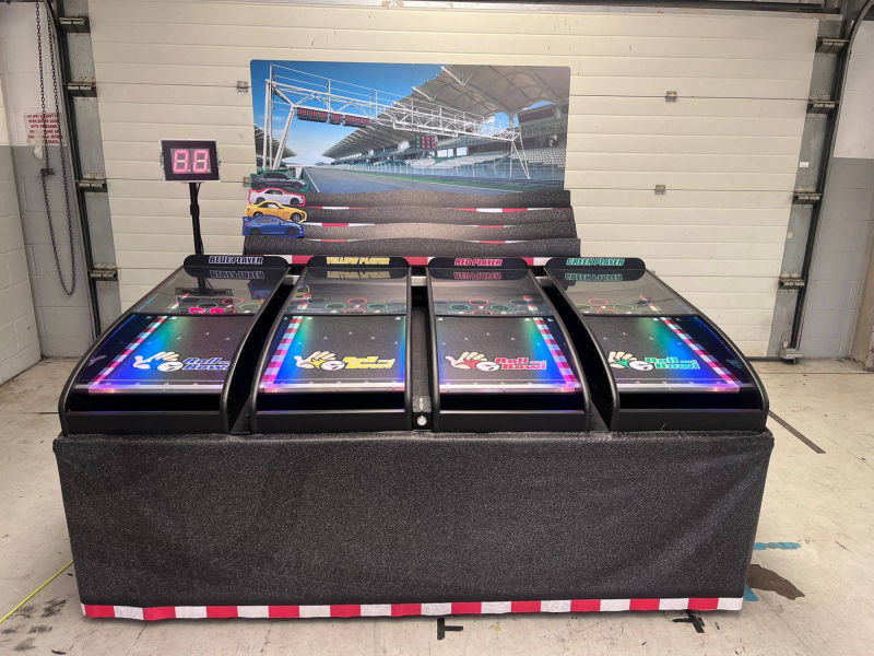 Completely portable this 4-person roll-a-ball game requires the players to roll their balls up the playfield and through the coloured holes to score points, the more points they score the further their horse, reindeer or themed character moves along the track.